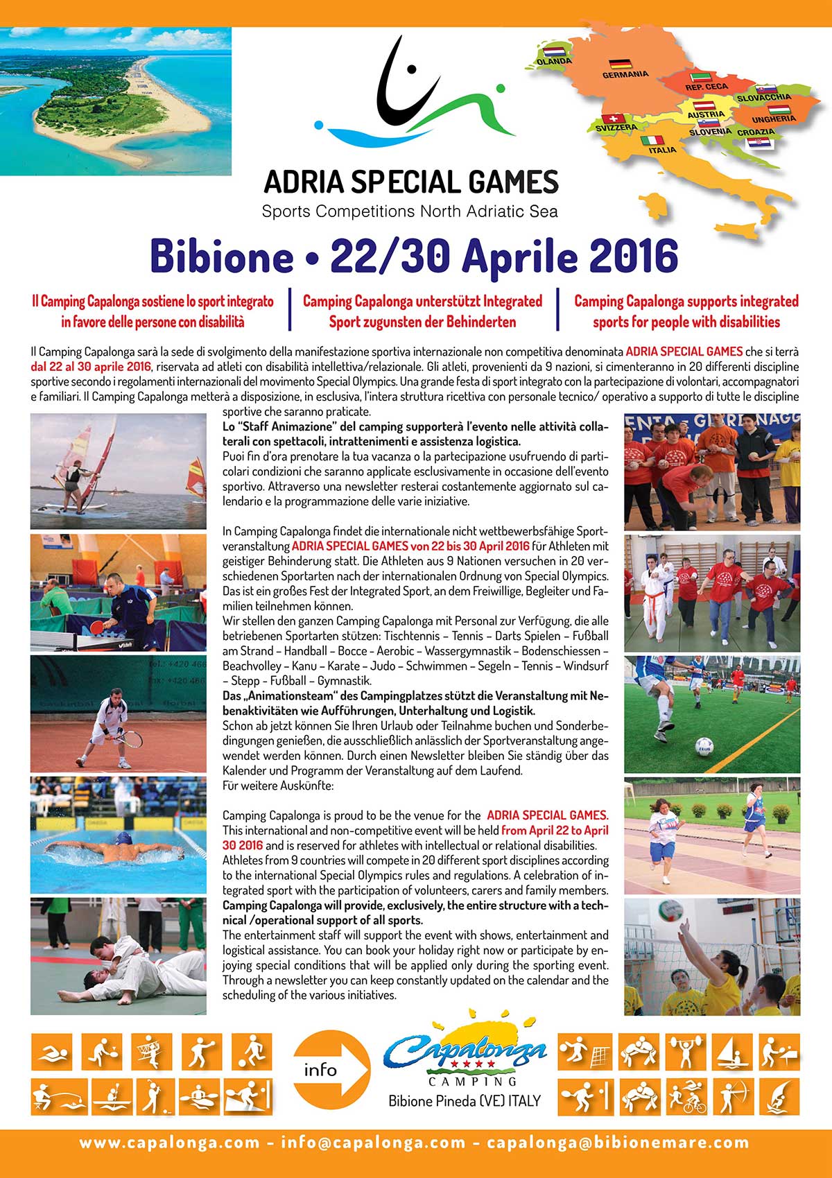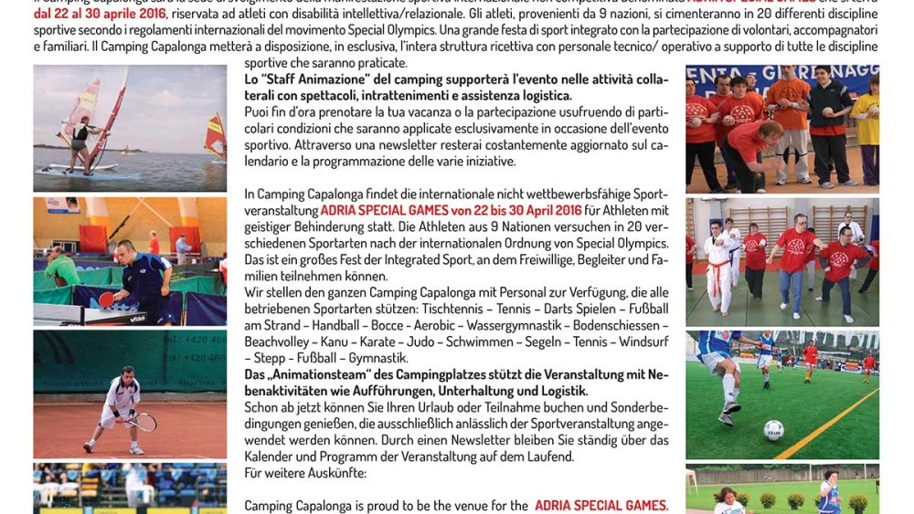 Il Camping Capalonga sarà la sede di svolgimento della manifestazione sportiva internazionale non competitiva denominata ADRIA SPECIAL GAMES che si terrà dal 22 al 25 aprile 2016, riservata ad atleti con disabilità intellettiva/relazionale. Gli atleti, provenienti da 9 nazioni, si cimenteranno in 20 differenti discipline sportive secondo i regolamenti internazionali del movimento Special Olympics. Una grande festa di sport integrato con la partecipazione di volontari, accompagnatori e familiari. Il Camping Capalonga metterà a disposizione, in esclusiva, l’intera struttura ricettiva con personale tecnico/ operativo a supporto di tutte le discipline sportive che saranno praticate.